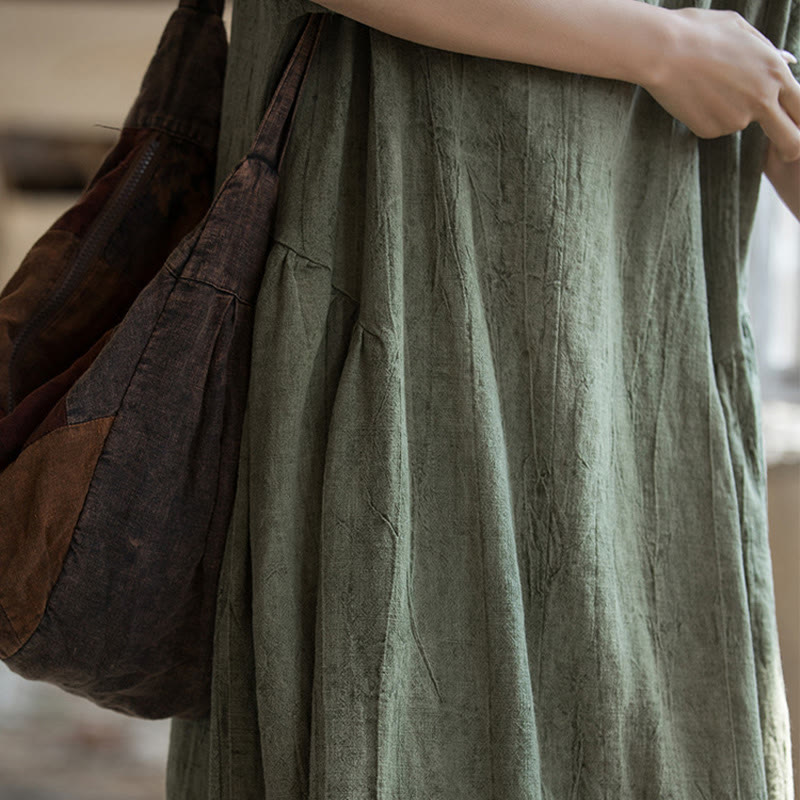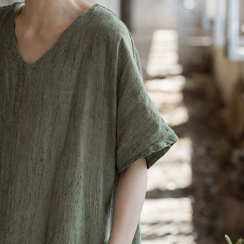 Robe mi-longue à col en V en lin à manches courtes et teinture faite à la main Buddha Stones