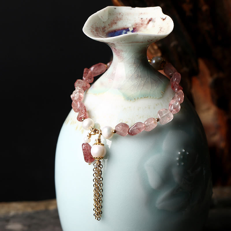 - Matériau : Quartz fraise, perle, plaqué or 14 carats
