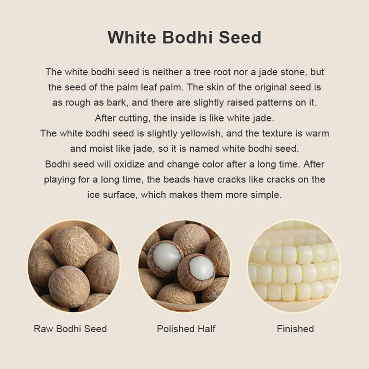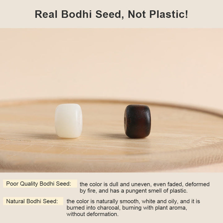 En sanskrit, Bodhi signifie « éveillé » ou « illuminé ». La graine de Bodhi signifie donc « graine illuminée ». En tant que graine « illuminée », de nombreux pratiquants portent les graines de Bodhi pendant leurs pratiques de méditation pour finalement atteindre l'illumination. Bodhi est également un terme du bouddhisme qui reflète la compréhension d'un Bouddha de la vraie nature des choses. Ces perles de graines mouchetées de noir ont une signification particulière pour tous les chercheurs de sagesse divine.