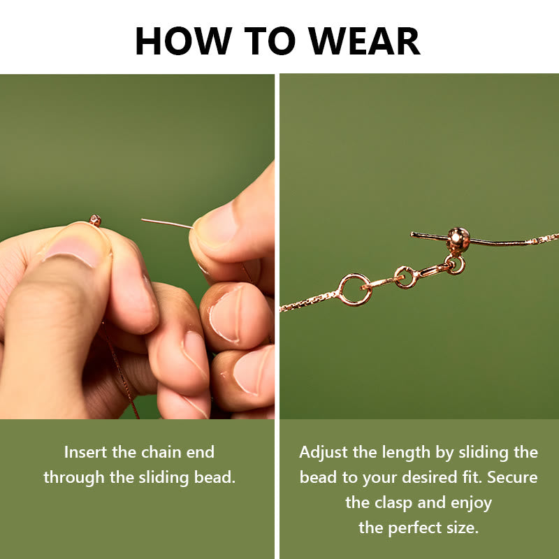 Tenez la perle coulissante d'une main et tirez doucement sur les extrémités de la chaîne avec l'autre main pour serrer ou desserrer le bracelet/collier.
