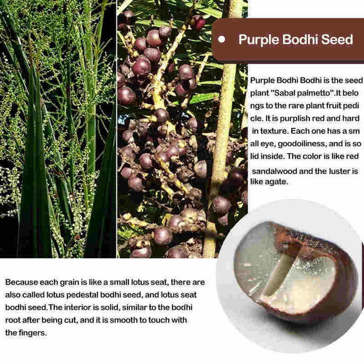 Bodhi violet Bodhi est la graine du palmier « Sabal palmetto ». Elle appartient à la famille des pédoncules fruitiers de plantes rares. Elle est rouge violacée et de texture dure. Chacune a un petit œil, une bonne onctuosité et est solide à l'intérieur. La couleur est comme le bois de santal rouge et le lustre est comme l'agate.
