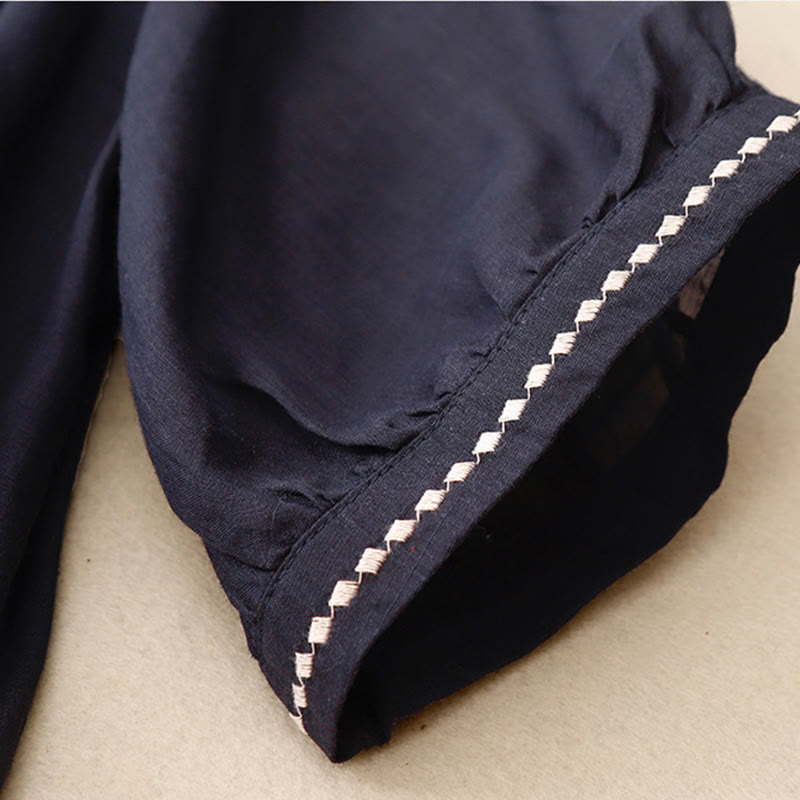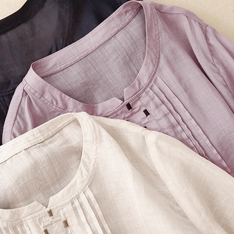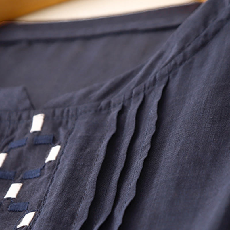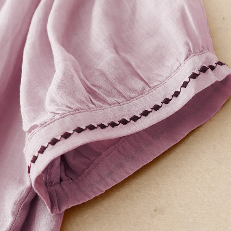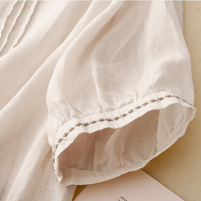 T-shirt à manches courtes en coton et lin pour femme, col ras du cou et plis, broderies de Buddha Stones