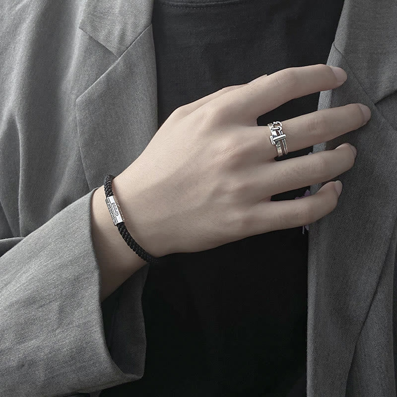 Les 7 mots sur le bracelet représentent les 7 vertus de l'être humain : la Foi, la Charité, la Prudence, la Justice, la Force, l'Espérance et la Tempérance.