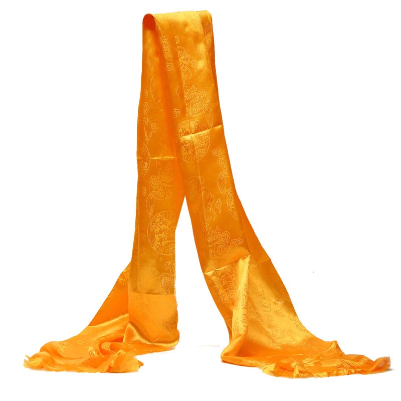 - Les Tibétains avaient l'habitude d'offrir des peaux d'animaux en cadeau, car il n'y avait pas de soie au Tibet. Selon les archives historiques de l'époque Bon, les gens mettaient de la laine de mouton autour de leur cou à l'époque du neuvième roi, Degong Jayshi, et se rendaient à certains rituels religieux. Cette tradition s'est transmise à partir de ce moment-là. Au fil du temps, les gens ont commencé à fabriquer des foulards et à utiliser de la soie. Ainsi, le foulard a remplacé la simple laine de mouton et les gens se mettaient des foulards autour du cou et de la tête.