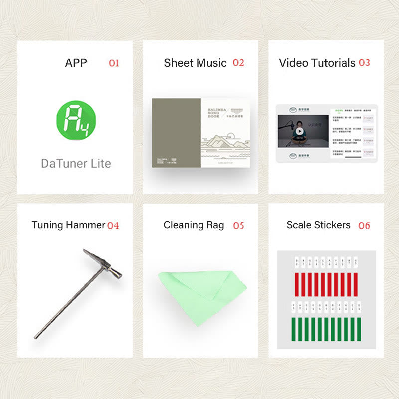 - Contenu de l'emballage : Kalimba*1, recueil de chansons Kalimba*1, marteau d'accordage*1, autocollant de notes*1, chiffon de nettoyage*1