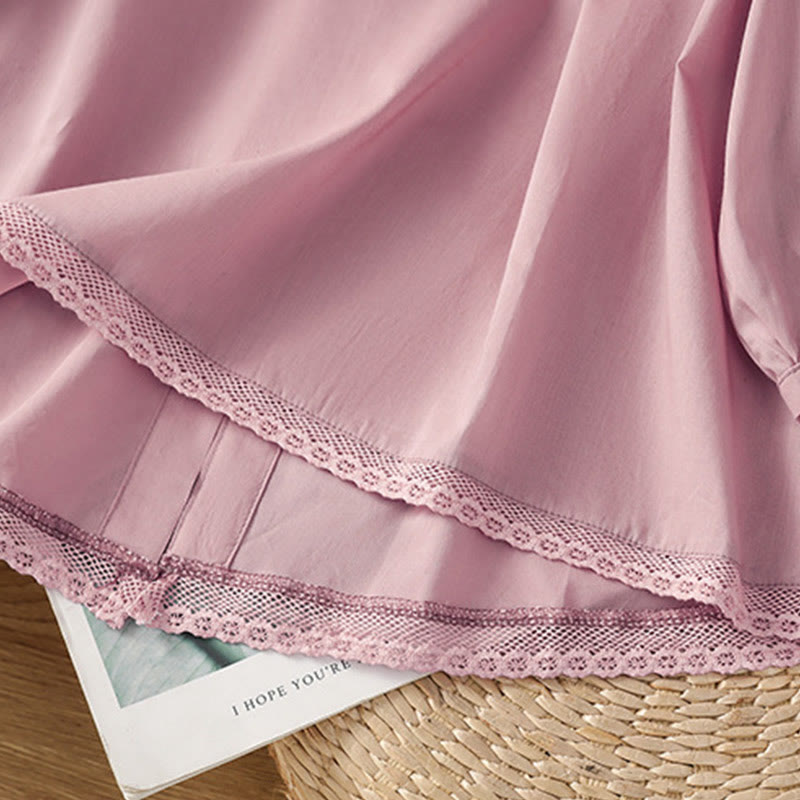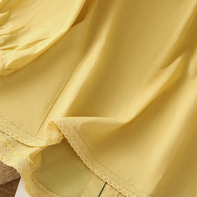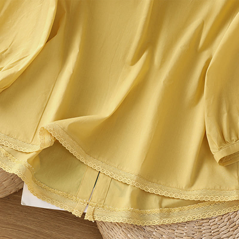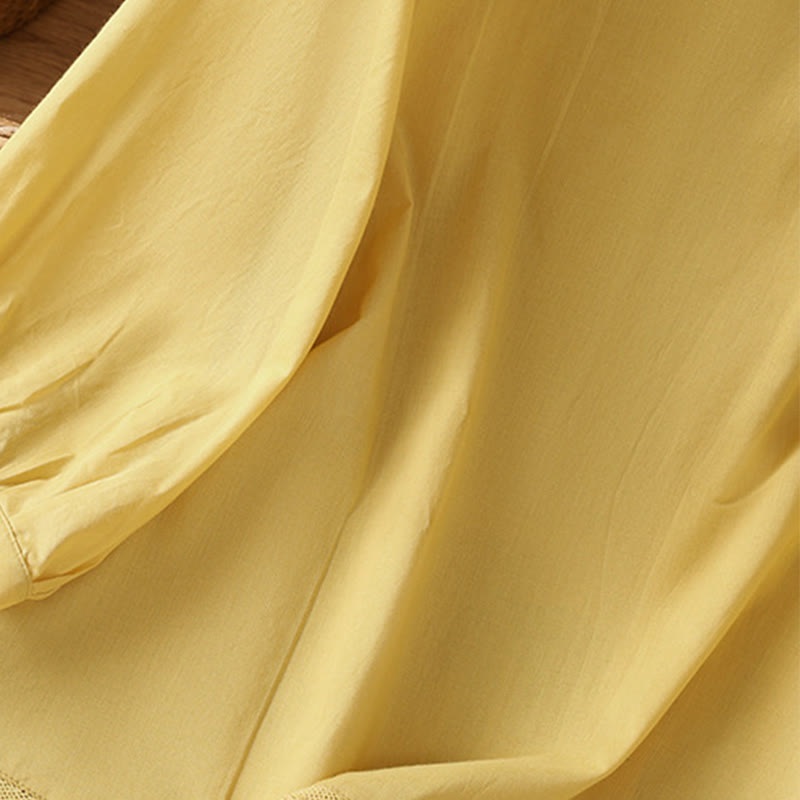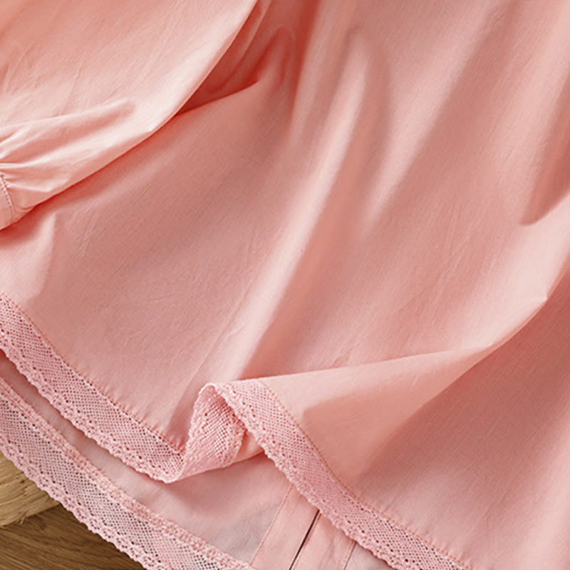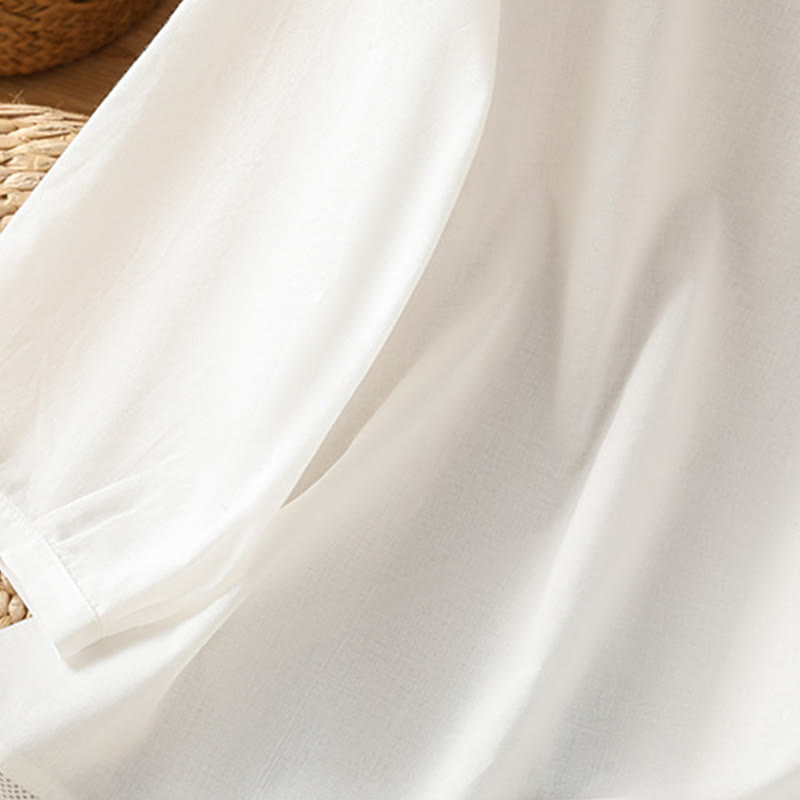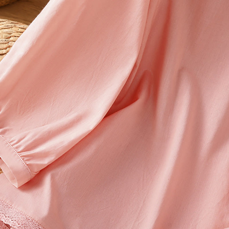 Chemise à col ras du cou en coton et lin à manches trois-quarts et simple boutonnage avec ourlet en dentelle et Buddha Stones