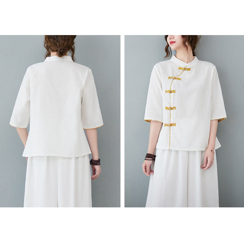 Chemise en coton et lin à manches mi-longues et boutons grenouille à motif floral Buddha Stones