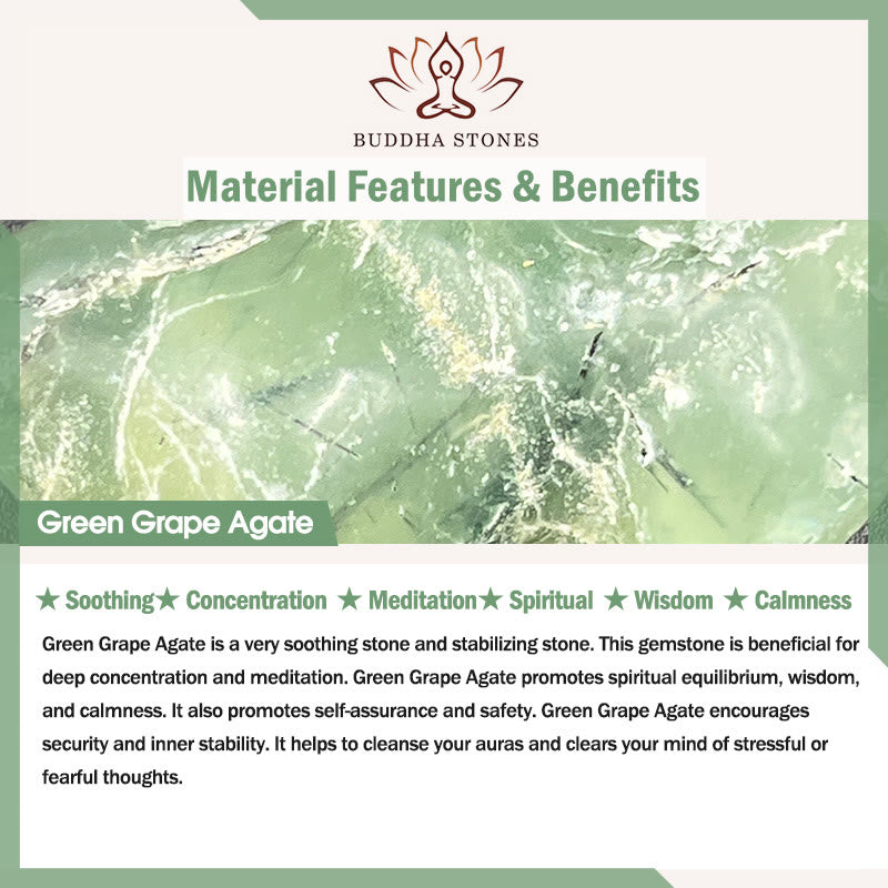 L'agate raisin vert est une pierre très apaisante et stabilisante. Cette gemme est bénéfique pour la concentration profonde et la méditation. Elle favorise l'équilibre spirituel, la sagesse et le calme. Elle apporte également confiance en soi et sécurité. L'agate raisin vert encourage la sécurité et la stabilité intérieure. Elle aide à purifier l'aura et à libérer l'esprit des pensées stressantes ou angoissantes.