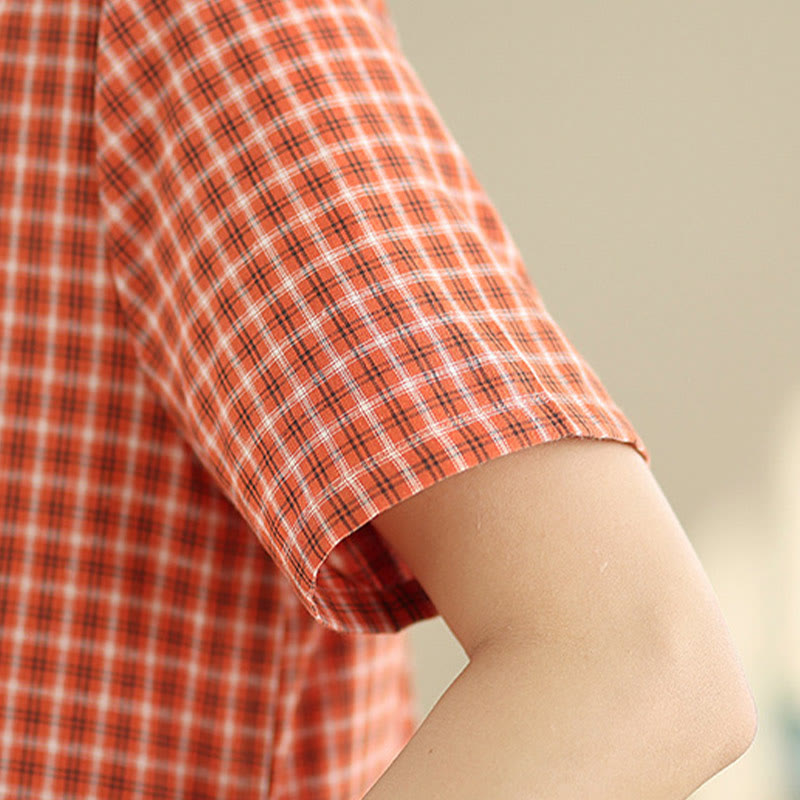 Robe mi-longue Buddha Stones à carreaux, couleur unie, col ras du cou, manches courtes, coton et lin, avec poches - OrangeRouge - US8-10,UK/AU12-14,EU40-42 (2XL) - image 0