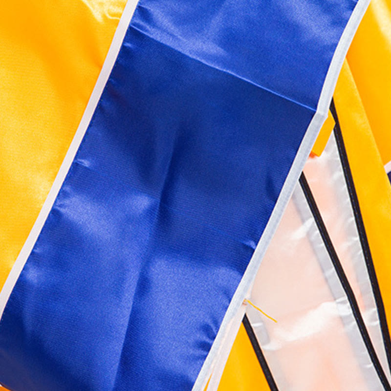 - Couleurs éclatantes et broderies symboliques : Le tissu lumineux est associé à des bordures bleues et à des motifs brodés de bon augure, symbolisant la protection, les bénédictions et l'harmonie spirituelle.