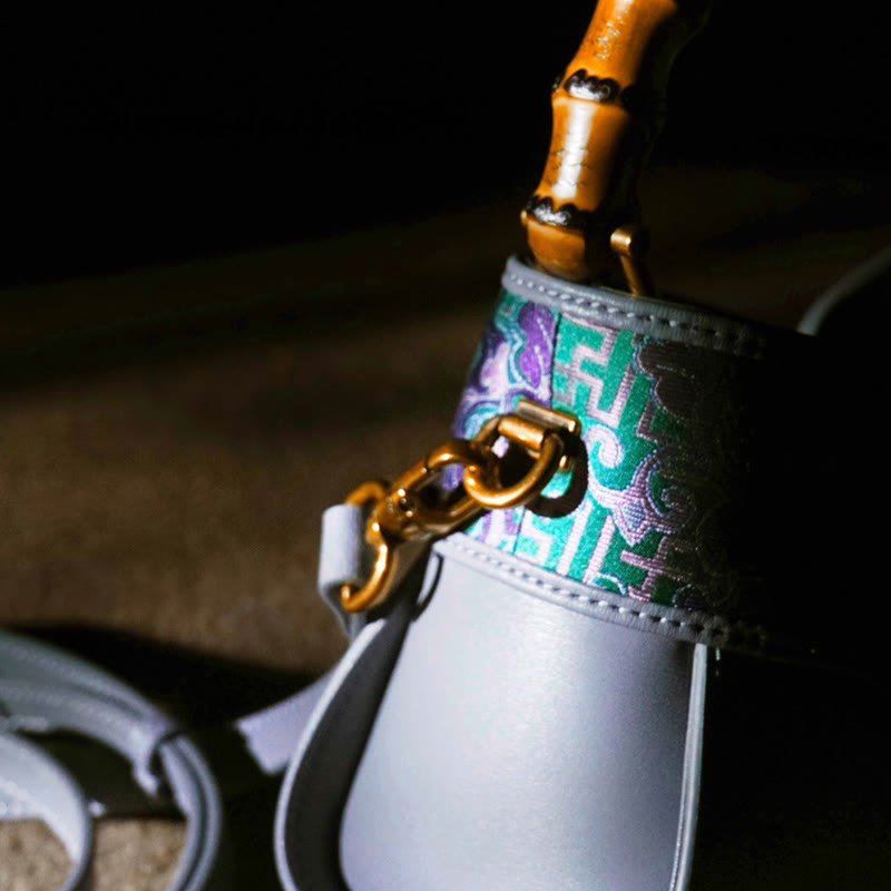 - Matière : soie de mûrier, brocart Song, cuir de vache fendu, métal, manche en bambou, soie Xiangyunsha