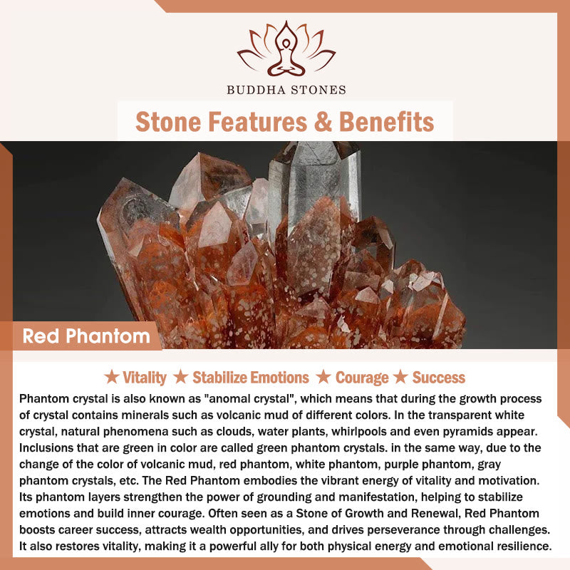 Le cristal fantôme est également appelé « cristal anormal », ce qui signifie que, lors de sa croissance, il contient des minéraux tels que de la boue volcanique de différentes couleurs. Dans le cristal blanc transparent, des phénomènes naturels tels que des nuages, des plantes aquatiques, des tourbillons et même des pyramides apparaissent. Les inclusions vertes sont appelées cristaux fantômes verts. De même, en raison du changement de couleur de la boue volcanique, on trouve des cristaux fantômes rouges, blancs, violets, gris, etc. Le Fantôme Rouge incarne l'énergie vibrante de la vitalité et de la motivation. Ses couches fantômes renforcent le pouvoir d'ancrage et de manifestation, contribuant à stabiliser les émotions et à développer le courage intérieur. Souvent considéré comme une pierre de croissance et de renouveau, le Fantôme Rouge favorise la réussite professionnelle, attire les opportunités de richesse et encourage la persévérance face aux défis. Il restaure également la vitalité, ce qui en fait un puissant allié pour l'énergie physique et la résilience émotionnelle.